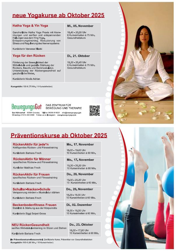 Unser BewegungsGut ist IHR Treffpunkt für Bewegung. Wir vereinen Bewegung mit Kompetenzund Spaß. Es erwarten Sie verschiedene Angebote zum Erhalt uns Aufbau Ihrer körperlichen Gesundheit und Fitness: